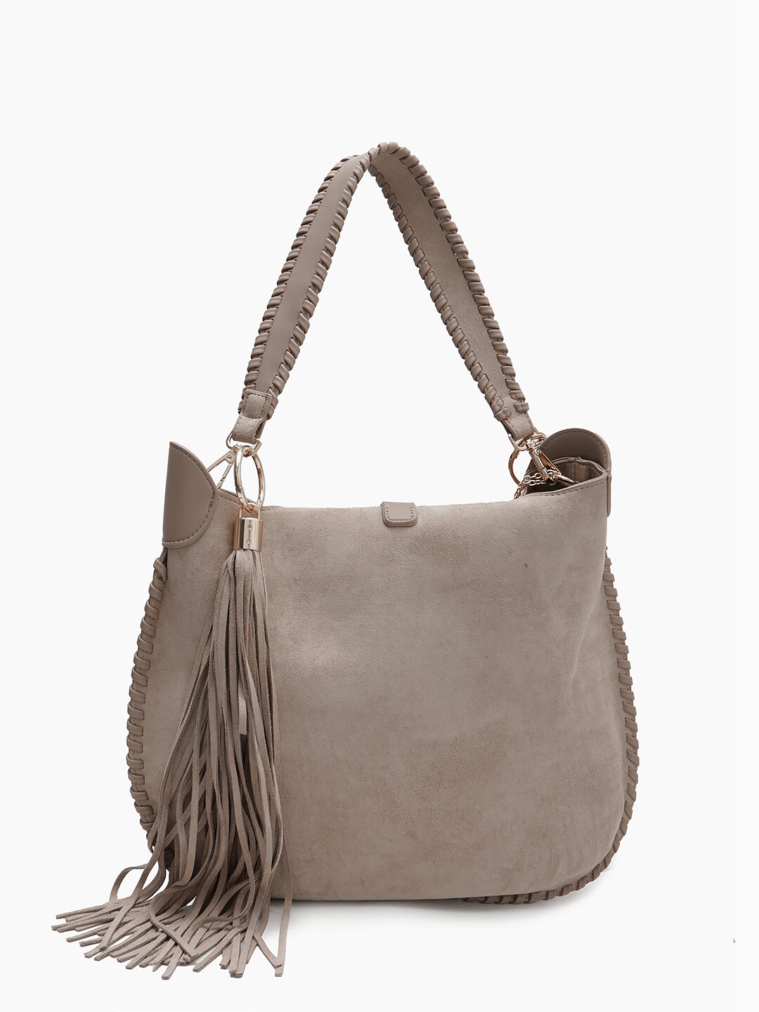 Сумка-мешок с плетением по периметру и на ручке от Alex Max из замши серо-бежевого цвета max4604-C light coffe