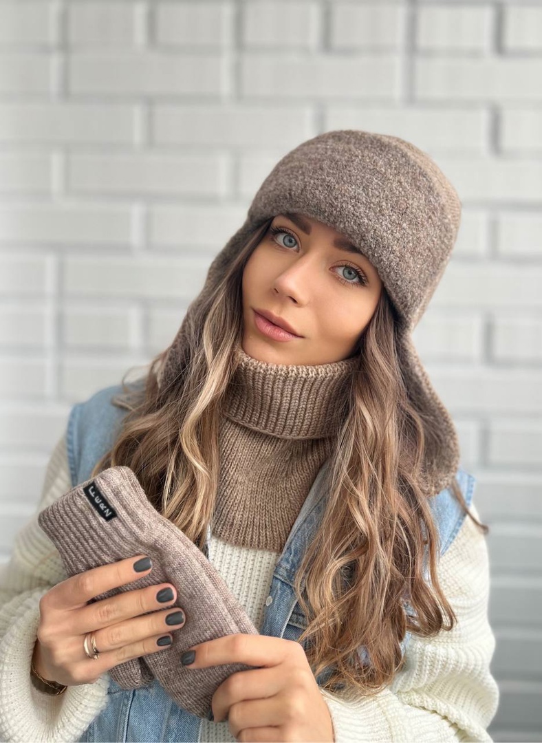 Двухслойная ушанка сочетает две пряжи, козырек и внутренняя часть ушей из пряжи букле.