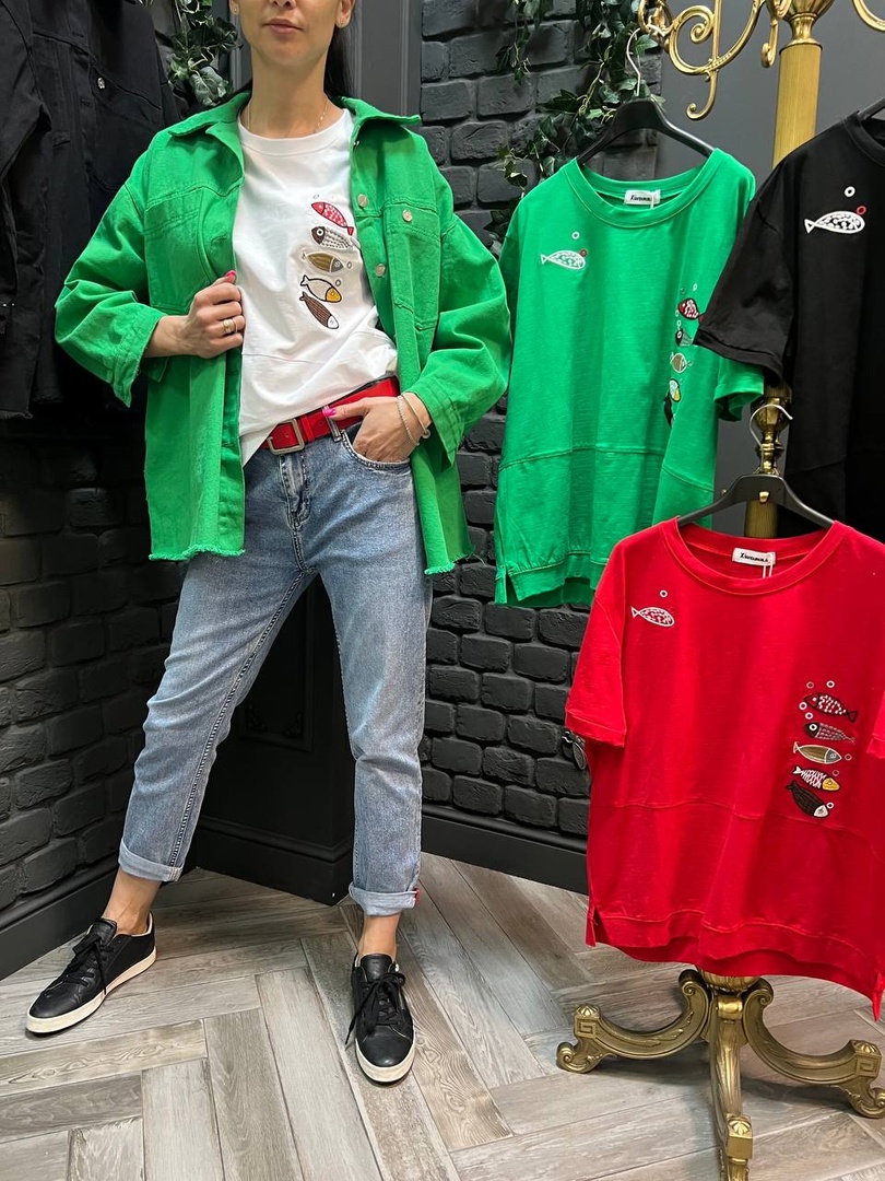 футболка  на фото хлопок размер единый вышивка рыбки ОГ 120 см можно одеть на 46-48 полный 50  - 1400 руб с орг%