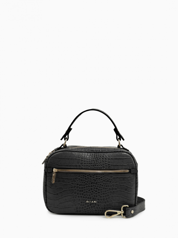 Длина сумки Ripani (Рипани) - 24 см (по дну), 24 см (по верхнему краю), ширина по дну - 9 см, высота  - 18 см. Сумка выполнена из натуральной кожи, состоит из двух автономных отделений, каждое закрывается на молнию. Внутри сбоку отделение на молнии, карманы для мелочей. снаружи спереди отделение на молнии.