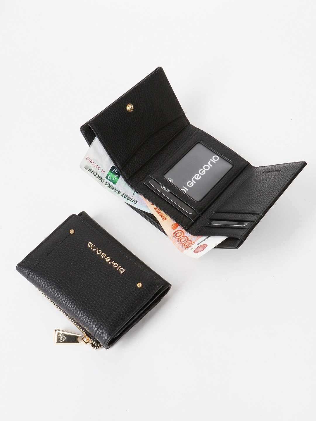 Стильный кошелёк от итальянского бренда Di Gregorio выполнен из натуральной кожи, декорирован фирменной фурнитурой и металлическими буквами логотипа бренда и стразами. Данная модель закрывается на молнию и кнопку.
