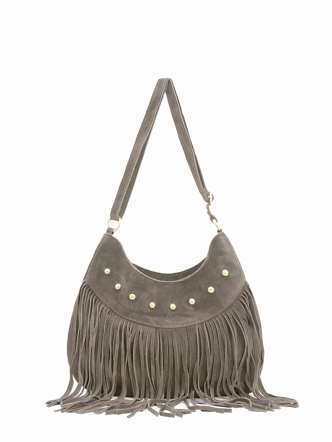Сумка-хобо от итальянского бренда BE NICE выполнена из натуральной замши, закрывается на молнию, декорирована клепками и бахромой. Максимальная длина ремня - 120 см, регулируется. Прилагается фирменный пыльник.
