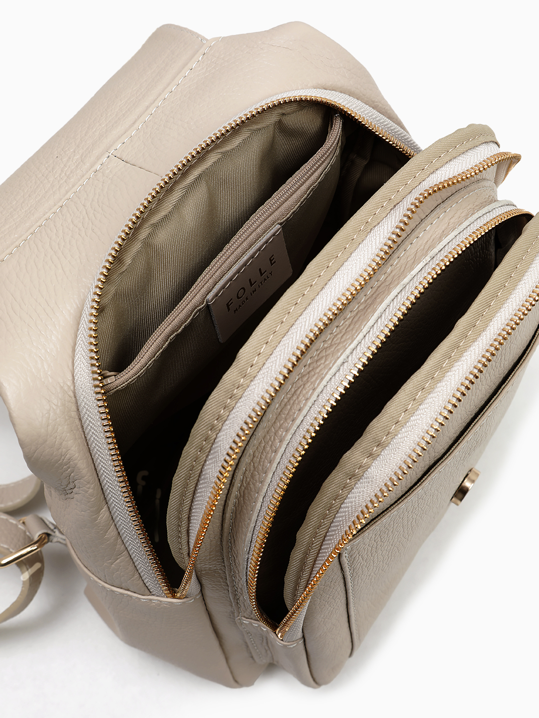 Женский рюкзак итальянского бренда FOLLE выполнен из натуральной кожи, закрывается клапаном на магнит, имеет два автономных отдела на молниях. Под клапаном открытый карман.