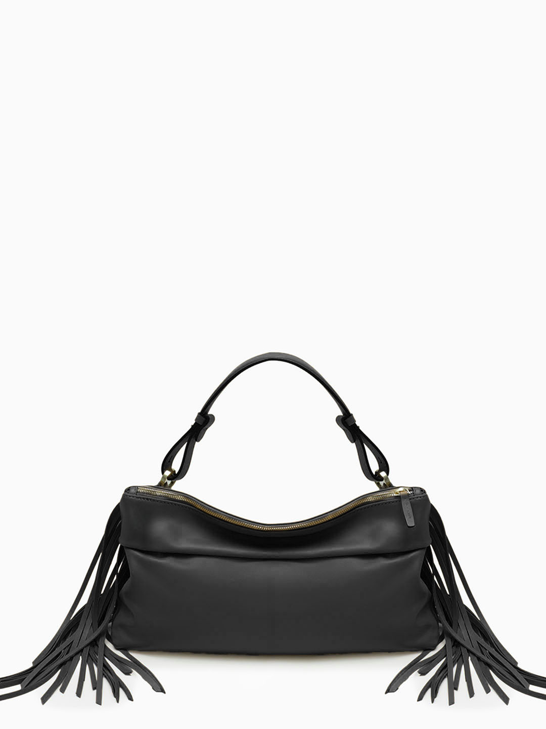 Сумка с бахромой от итальянского бренда Loristella выполнена из натуральной гладкой кожи. Данная модель закрывается на молнию, носится на сгибе руки, в руке или на плече на кожаном регулируемом ремне, максимальная длина которого 124 см.