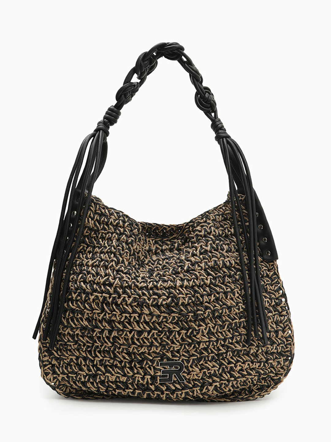 Большая сумка-мешок из бежевой и черной рафии от Ermanno Firenze с плетеной ручкой sce12402083 black
