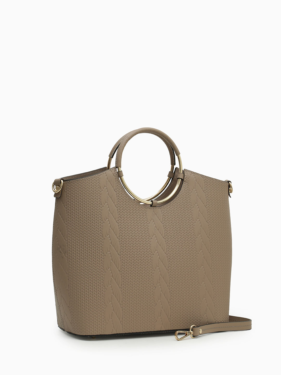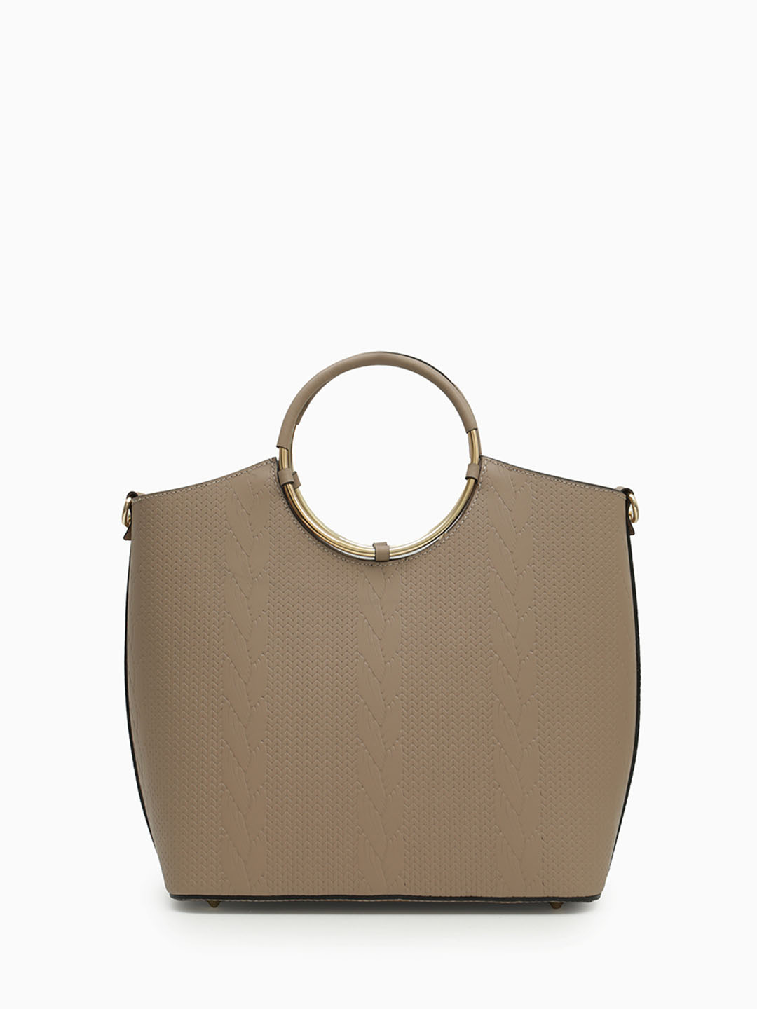 СУМКА ЖЕСТКОЙ ФОРМЫ С РУЧКАМИ-КОЛЬЦАМИ ОТ BE NICE ИЗ КОЖИ ЧЕРО-БЕЖЕВОГО ЦВЕТА С ТИСНЕНИЕМ