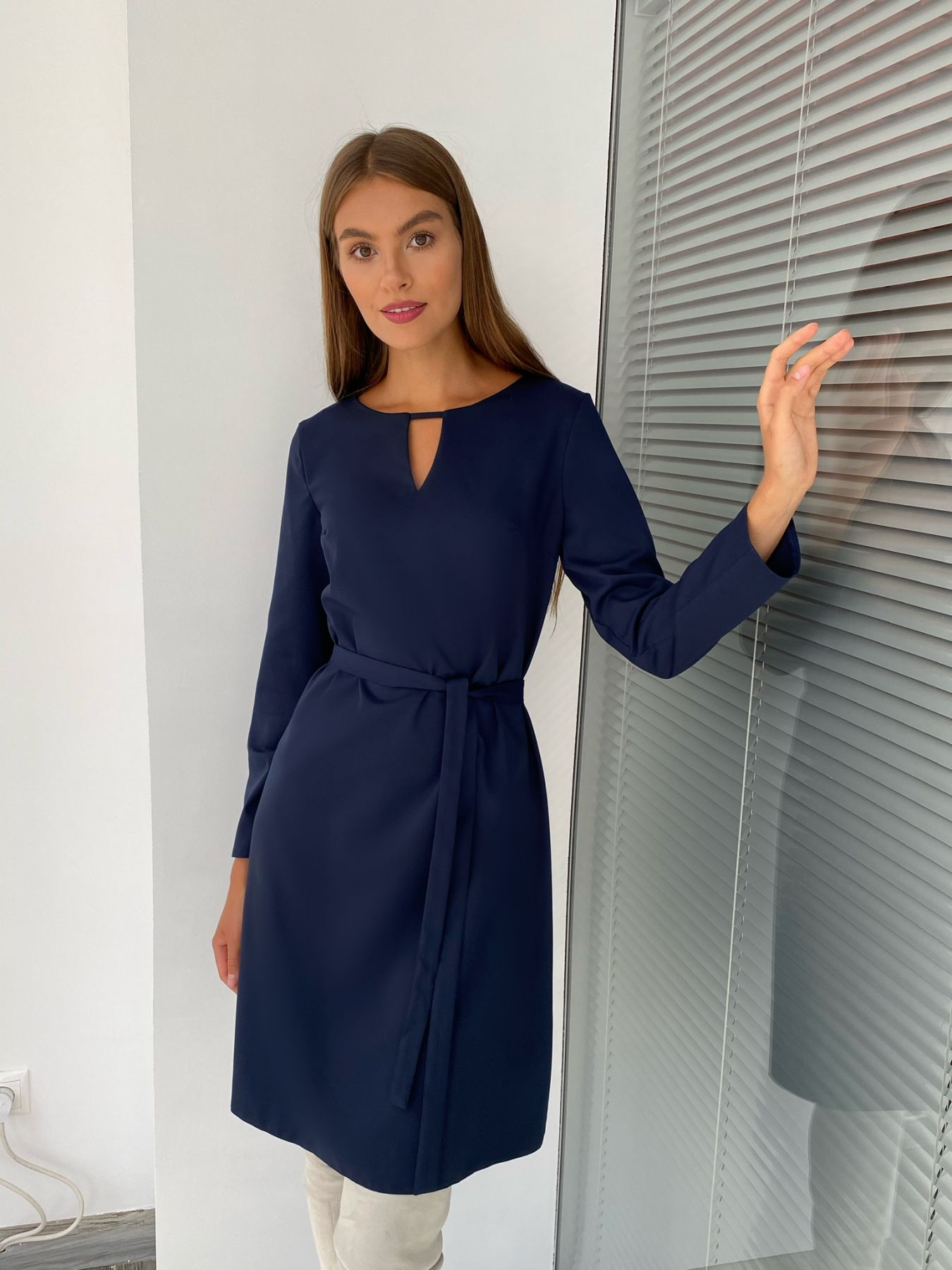 Платье А-силуэта длиной до колен, без застежки, с прямым длинным рукавом. Оригинальность платью придает неглубокий щелевидный вырез горловины с изящной перемычкой. Пояс в комплекте.